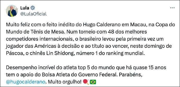 今晚,巴西总统卢拉发文:“相称风物看到雨果·卡尔德拉诺在澳门乒乓球全国杯上取得前所未有的设立。在这场有48名海外顶尖选手参赛的比赛中,雨果打败了全国名挨次一的林诗栋,初度代表好意思洲选手干与决赛并夺得冠军。”