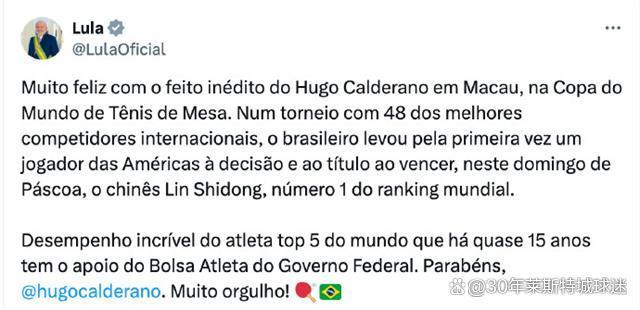 赛后,巴西总统卢拉-达席尔瓦发文恭喜雨果夺冠,陈赞其在回生节星期天打败了全国排行第一的林诗栋,初次代表好意思洲选手参加决赛并夺得冠军!“恭喜雨果选手,极端自爱!”雨果回家后,可能会受到堪比巴西国足全国杯夺冠的礼遇,乒乓球亦然球!