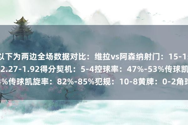 以下为两边全场数据对比:维拉vs阿森纳射门:15-15射正:6-9预期进球:2.27-1.92得分契机:5-4控球率:47%-53%传球凯旋率:82%-85%犯规:10-8黄牌:0-2角球:3-3 体育集锦