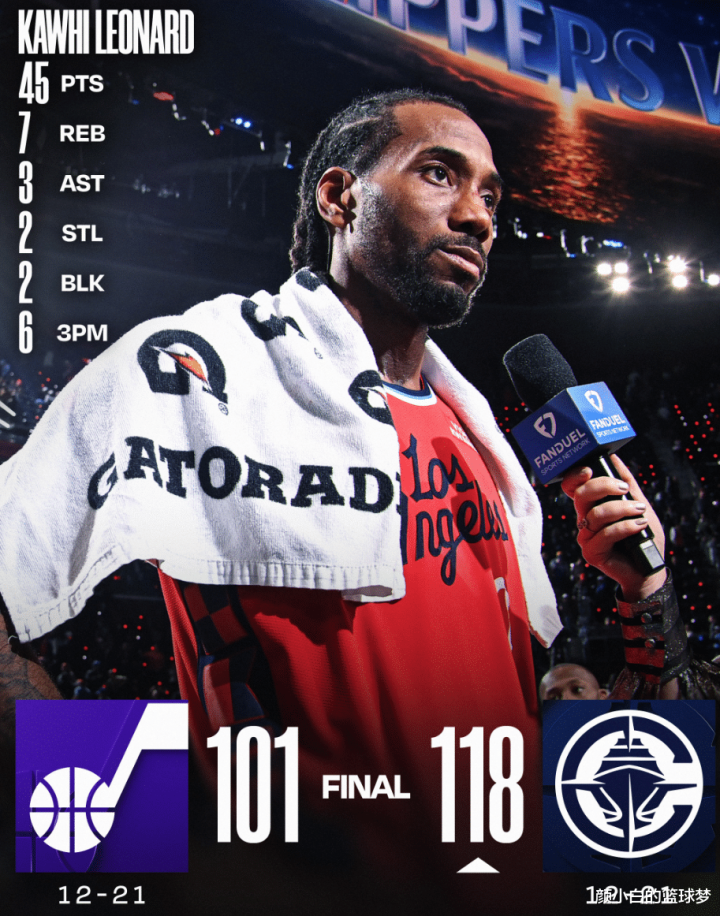 快船118-101大捷爵士,天然开场快船一度打出了16-0的攻势,可进程爵士三节的勤恳两队的分差只剩下1分,可小节的伦纳德平直化身了篮球之神单节20分一波流打崩爵士,小节快船打出了一波36-20的攻防海浪,但哈登在小节1分钟没打。